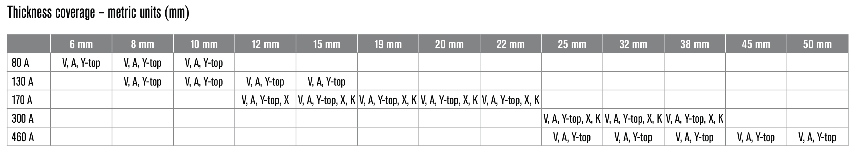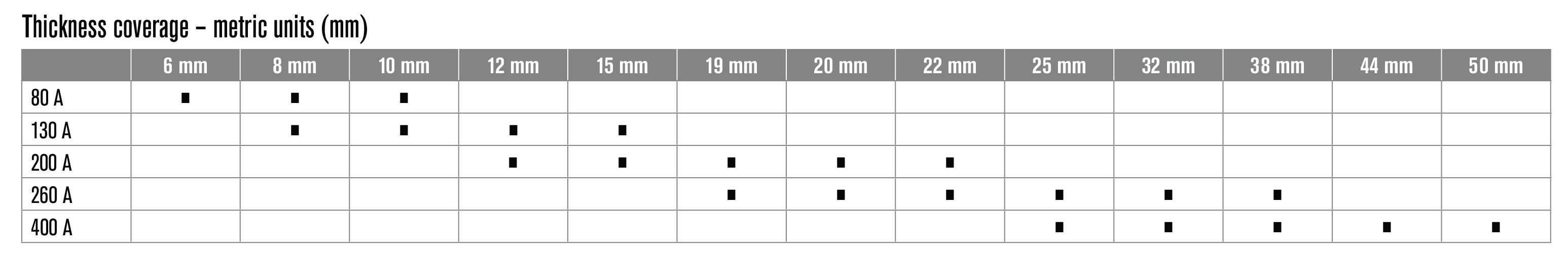 Thickness Coverage görseli; amperaj ve malzeme kalınlığına göre hangi kesim tiplerinin uygulanabildiğini gösterir. Doğru prosesi seçmeyi hızlandırır ve konfigürasyon planlamasını pratikleştirir. |