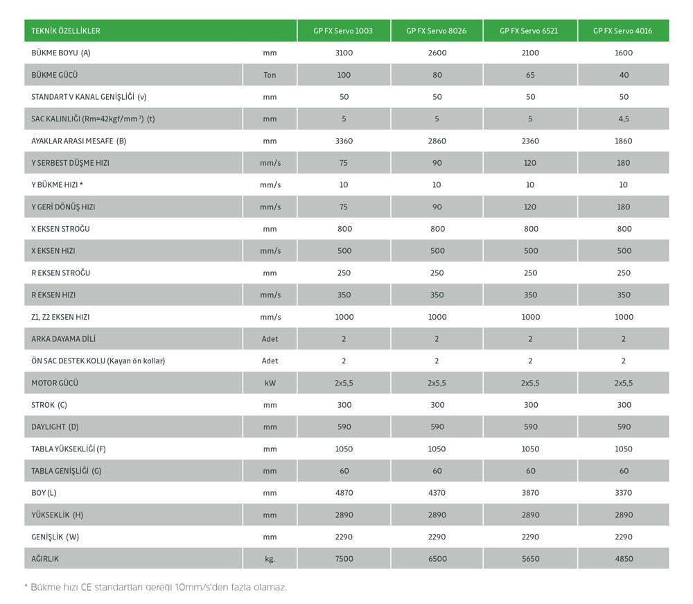 4 eksen (X, R, Z1, Z2) servo motorlu arka dayama istenilen geometriye göre 0,05 mm pozisyonlama hassasiyetine sahip arka dayama hassas bükümler elde etmenizi sağlar.