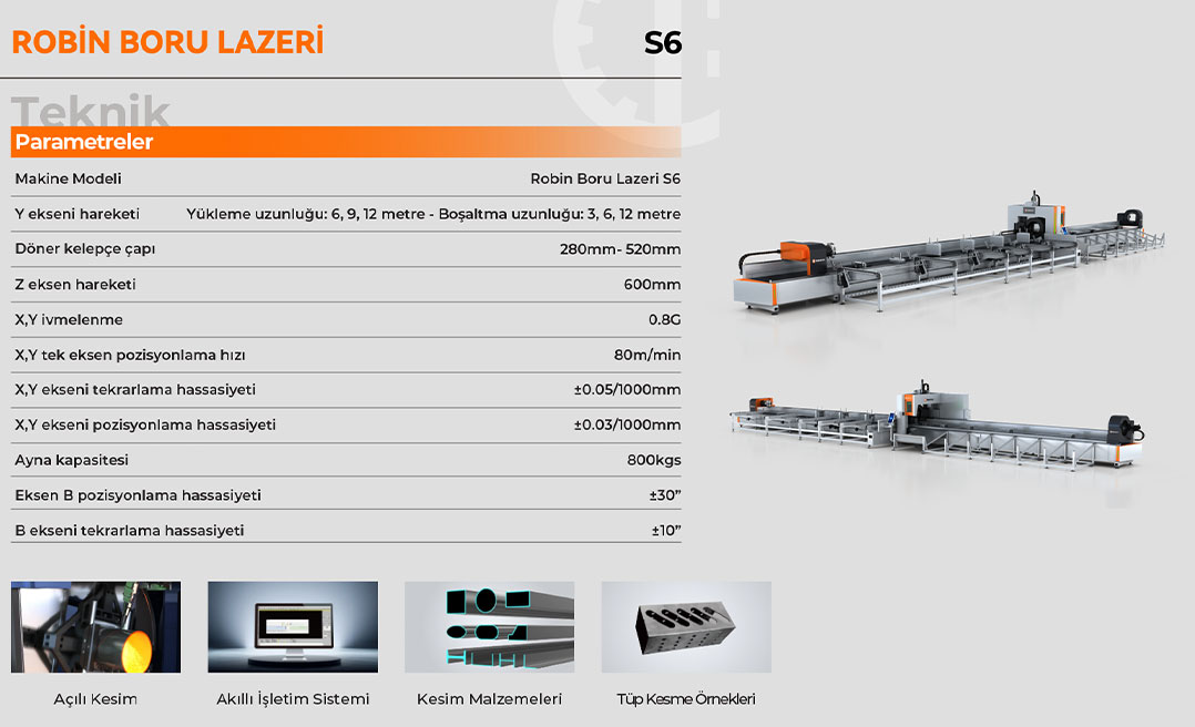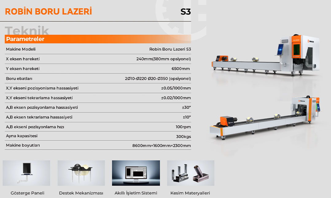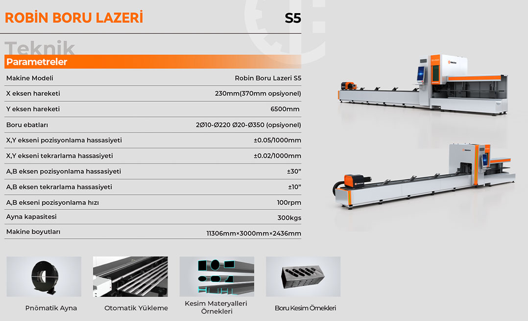 ROBIN Serisi Boru ve Profil Lazer Kesim Makineleri, yüksek verimlilik ve esneklik için tasarlanmış çok yönlü bir çözümdür. Farklı boyut ve kapasitelerde sunulan bu makineler, otomatik, yarı otomatik veya manuel çalışma seçenekleriyle değişen kullanıcı beklentilerini karşılar. Yuvarlak, kare ve dikdörtgen boruları yüksek hassasiyetle işleyebilen ROBIN Serisi, geniş kesim kapasitesiyle güvenilir ve istikrarlı bir performans sunar. Sağladığı esneklik ve güvenilirlik sayesinde, ROBIN Serisi boru lazerleri çeşitli üretim ortamlarına kolayca entegre olur. Boru ve profil işleme uygulamalarında hassas, verimli ve kaliteli kesim sunarak üretim süreçlerini optimize eder. ROBIN Serisi boru lazerleri, farklı kullanıcı ihtiyaçlarına uygun, yüksek verimli ve maliyet açısından avantajlı bir boru ve profil kesim çözümü sunar.