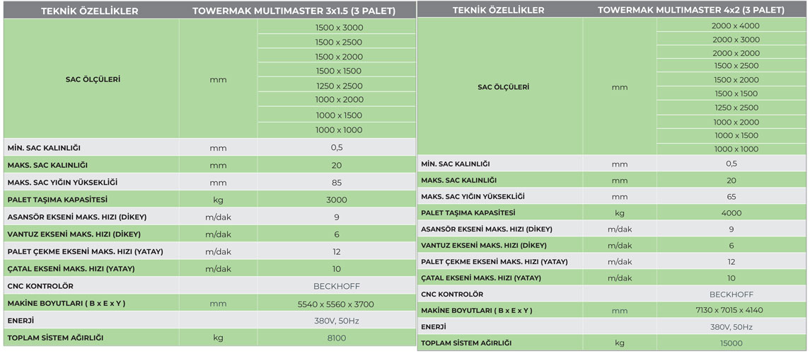 TOWERMAK, lazer kesim makineleri için 1500x3000 mm sacların insansız yükleme ve boşaltılmasını sağlar. Yüksek güvenilirlik, esneklik ve kullanım kolaylığı sunar; malzeme türü, kalınlığı ve yerleşimine bağlı olarak üretim kapasitenizi %60’tan fazla artırır. Çoklu palet istifleme sistemi ile atölyelerde yer kaybını önlerken hassas sacları darbe ve çiziklere karşı korur.