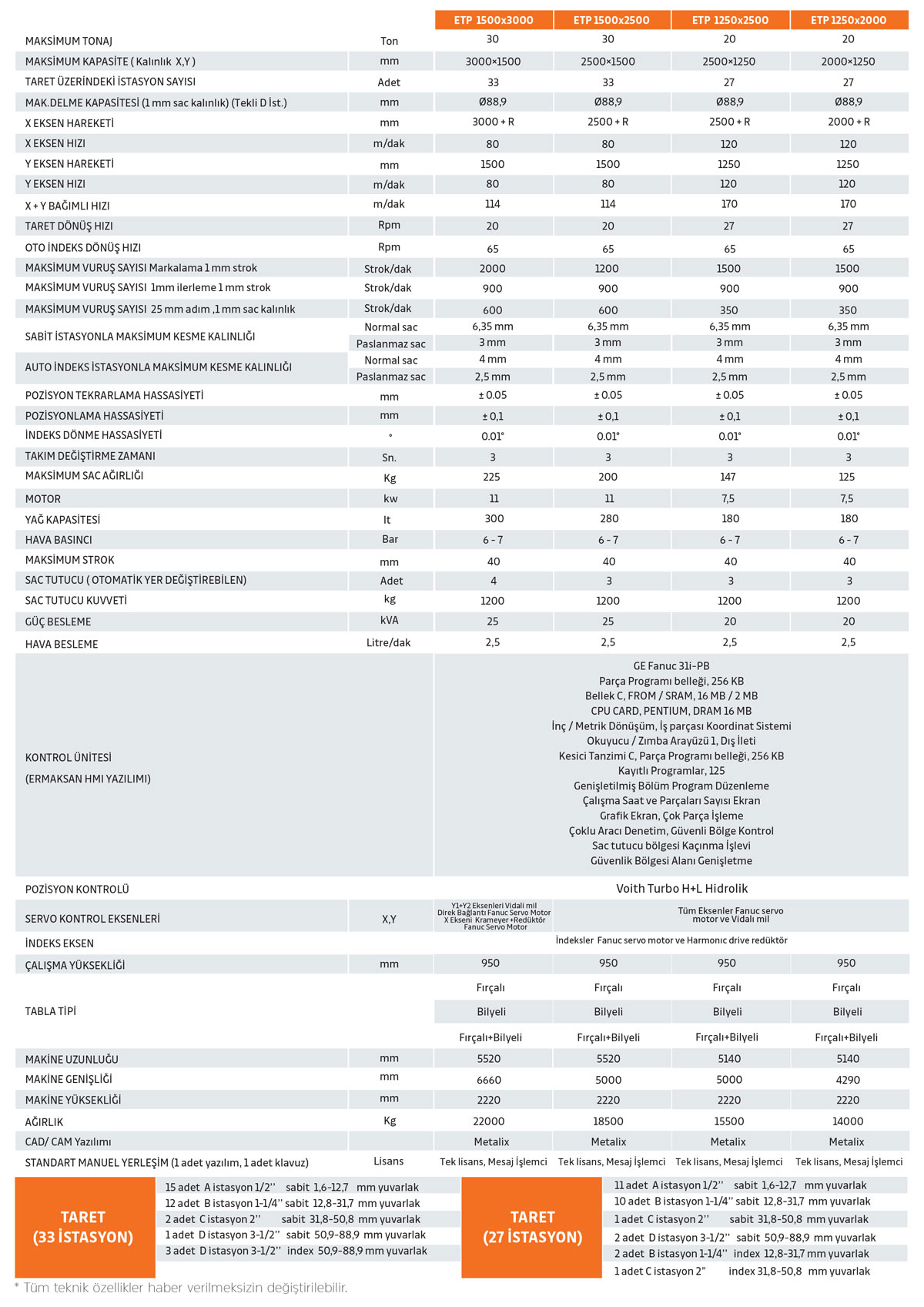6 mm kalınlığa kadar saclarda çeşitli uygulamara izin veren ETP CNC Taret Panç Pres çelik konstrüksiyon ve monoblok yapısıyla yıllarca tüketici ihtiyaçlarını karşılamak için tasarlanmıştır.