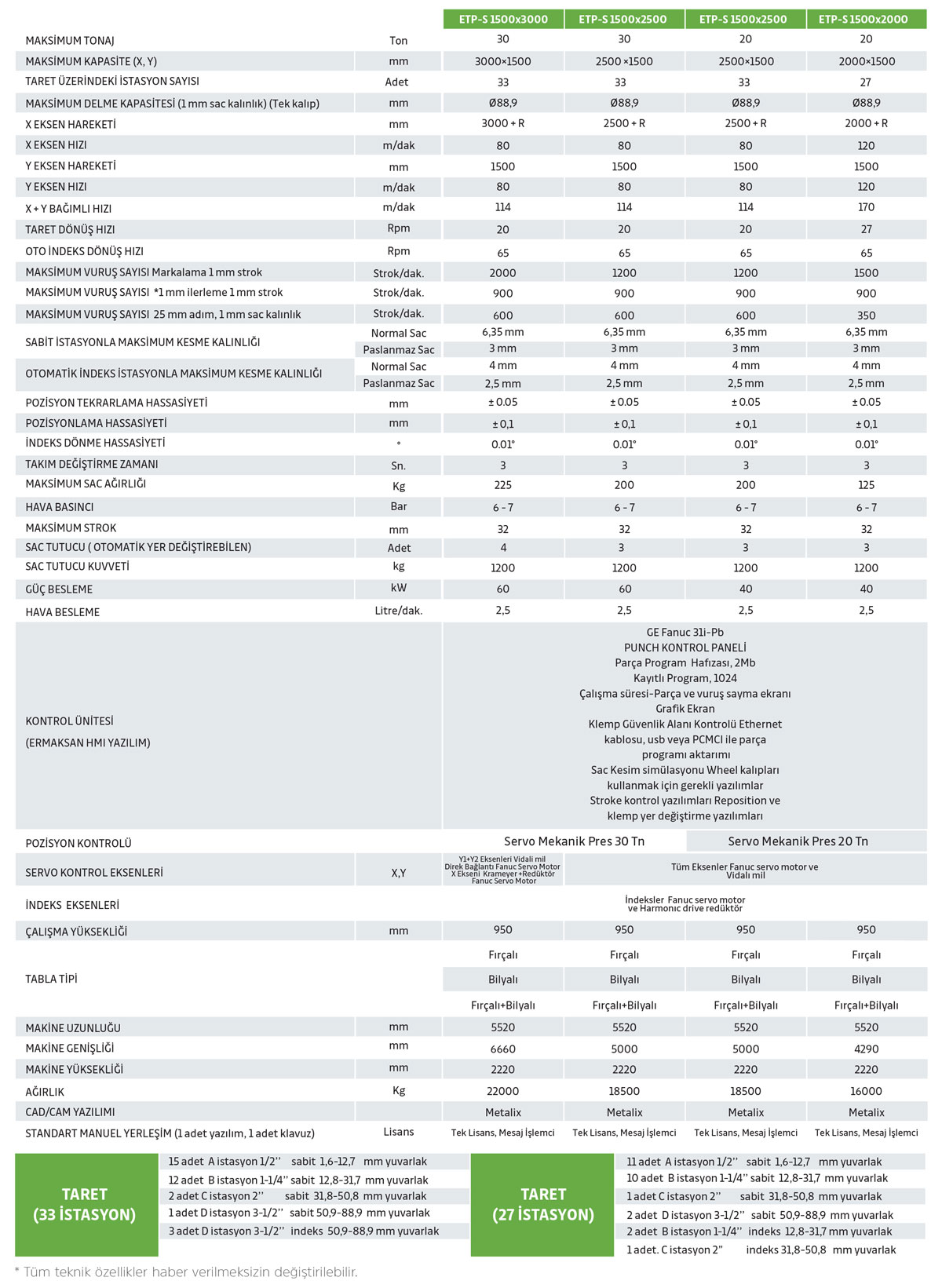 6 mm kalınlığa kadar saclarda çeşitli uygulamalara izin veren ETP CNC Servo Taret Panç çelik konstrüksiyon ve monoblok yapısıyla yıllarca tüketici ihtiyaçlarını karşılamak için tasarlanmıştır.